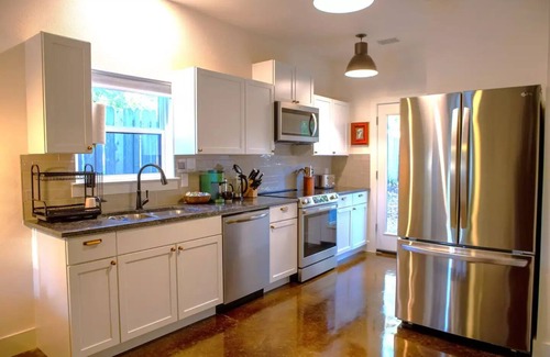 800 sq. ft of newly built comfort and luxury. 2 bedrooms each have their own bathroom. Pull-out queen size sofa boasts a brand new, luxury matress. One of our personal favorite features is the deck in your own private backyard, shaded by mature trees. Even in the heat of the Texas summer, it's a lovely and serene respite from the world.