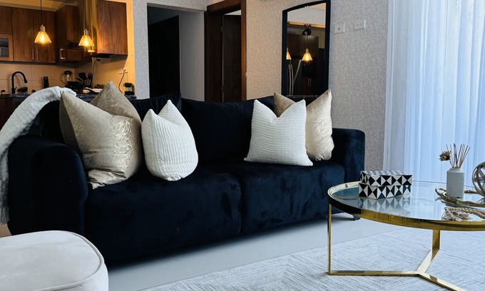 Security is a top priority with 24-hour surveillance, ensuring a safe and worry-free stay. The apartment itself boasts three spacious bedrooms and two modern bathrooms, including a master suite with its own private bathroom. The fully equipped and modern kitchen makes meal preparation a breeze, and the spacious balcony offers a relaxing spot to enjoy the surroundings.