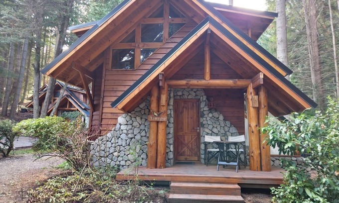 The cabins are located within a centennial forest and meters away from a beach on the shore of Lake Nahuel Huapi.