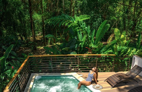- Shared swimming pool area surrounded by Tropical Rainforest nature, including hot tub, and an additional shallow pool for children, with adjoining lounging areas, covered pavilion, outdoor shower, and washroom.