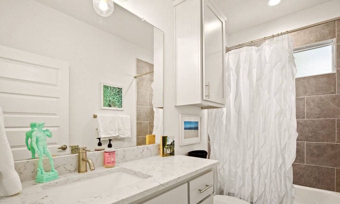 This brand new modern farmhouse-style home features an open floor plan with lots of natural light and mid-century electric furnishings in a highly desirable tree-lined neighborhood a short 5-mile drive to downtown Austin, Zilker Park and, Barton Springs. Close to popular South Congress and St. Elmo's Entertainment area. Perfect for your next bachelorette, birthday, and more!