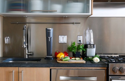 You’ll enter into a spacious living room with an open kitchen, 10-foot ceilings and oversized windows. The kitchen is equipped with stainless steel appliances and Italian stone counter-tops. The first floor also has a full bathroom with a shower stall. There is a large couch that can be used as an extra bed need be.