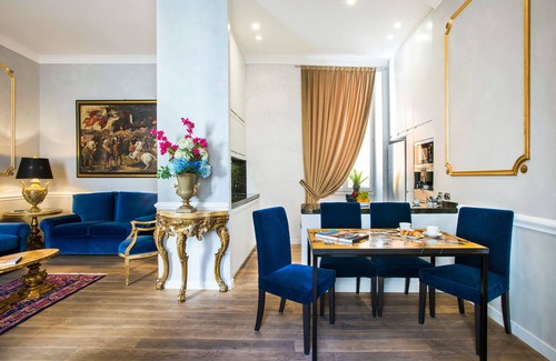The fine luxurious wood floors, the velvet curtains, seats and beds, the antiques marble mosaic tables, the design bathrooms furnitures and the high end antiques furnishing make this apartment the ideal choice for families, couples or small group of friends, seeking elegance and comfort in the heart of the Eternal City.