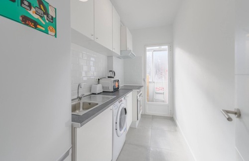 The kitchen is equipped with a refrigerator, an oven, an induction hob and cabinets and work surfaces that provide ample space for cooking and storing food.