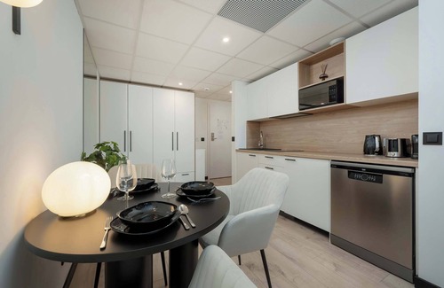 This stylishly furnished apartment can accommodate up to 4 people. It consists of a living room with a kitchenette, a cozy bedroom, and a bathroom with a shower. The modern space has a unique charm created by the bright decor and elegant furniture. The coziness of the apartment is complemented by a wide range of amenities that make it feel like home. The apartment is equipped with multimedia facilities such as a flat-screen TV and free Wi-Fi, and guests who work remotely will find a comfortable place to work with a laptop. The apartment offers a view of the modern Wroclavia building. To start your stay off right, we provide guests with a complimentary set of toiletries, towels, and bed linen. The building has a common area with washing machines, snack machines and seating places.