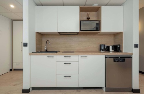 Refrigerator with freezer, induction hob, coffee maker, electric kettle, microwave, cups, set of dishes, cutlery, frying pan, wine glasses, dishwasher, toaster