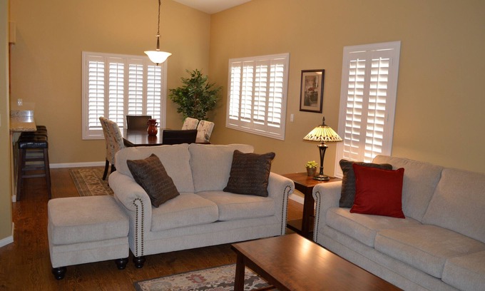 Our town home is located in a gated community with swimming pool and hot tub, open from April through October. Enjoy all the perks of being in your own home, including fully equipped kitchen, linens, washer, dryer, WiFi, and printer / copier. This elegantly furnished single story home also has vaulted ceilings, attached two car garage, and shaded / enclosed patio. It features granite counter tops in the kitchen and bathrooms, wood and tile flooring in living spaces, luxury vinyl in bedrooms. The kitchen features open design to the living areas and lots of counter space. The living room has a gas fireplace. All bedrooms and living room have a high definition television, vaulted ceilings, and ceiling fans. Our home is well maintained and tastefully furnished, with updates being made annually. In 2015, the washer, dryer, and dish washer were replaced. In 2016, the refrigerator and gas stove were replaced. In 2017, dining room chairs and kitchen stools were upgraded. In 2018, a water softener system was added. In 2019, hot water heater was replaced. In 2021, luxury vinyl flooring installed in bedrooms, upgraded TV installed in the living room, new WiFi installed, and garbage disposal replaced. In 2022, the HVAC system was replaced, and new pots / pans purchased. In 2023, couch, love seat, area rug, printer and microwave replaced.