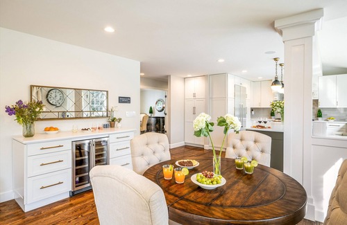 Perfect for families, corporate groups, or extended stays, the property offers multiple living spaces, a gourmet kitchen, a private gym, and expansive outdoor areas with a hot tub—ideal for gathering together and simply unwinding. Step inside and be greeted by sun-filled rooms and custom details throughout. The inviting living room with fireplace flows seamlessly into a chef’s kitchen featuring high-end appliances, a spacious island, and a sunny breakfast table. A formal dining room and a cozy reading space with a piano add both elegance and charm.
