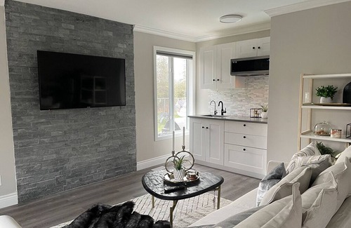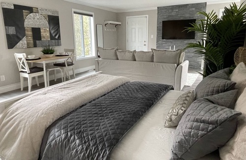 Enjoy luxury stay in this totally unique, immaculate and private suite. Not far away from the city, you will relax and enjoy nature. In summer you have access to shared pool right at your door step. Lots of outdoor activities includes but not limited to forest trails hiking, camping, bon fire, all season hot tub and many more. This studio is spacious with private entrance and free parking on premises