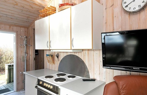 Layout: open kitchen(cooker(electric), hood, coffee machine, fridge-freezer, high chair), Living/bed room(TV(satellite, german television channels, danish TV channels (DR1 and TV2)), radio), bedroom(double bed, children's bed), bedroom(2x bunk bed), bathroom(floor heating)(bathtub or shower, washbasin, toilet), carport, terrace, BBQ