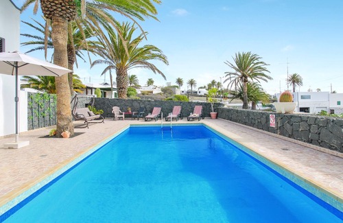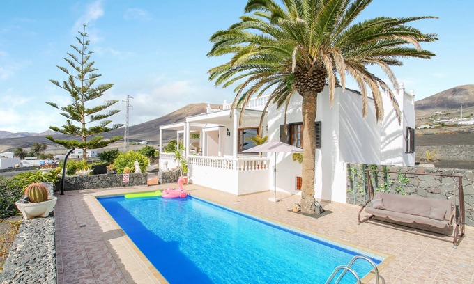 Casa Salinoco sits on a 2,000 m² property in Mácher and boasts a large pool and terraces with marvelous views over the neighboring islands of Fuerteventura and Isla de Lobos. Stretching over 2 floors, the holiday home consists of a living room, a well-equipped kitchen, 4 bedrooms (one of which with 2 single beds) as well as 2 bathrooms and can therefore accommodate 8 people. Additional amenities include Wi-Fi, several flat-screen TVs, a washing machine and fans. In the outdoor area you will find an extensive veranda with a comfortable lounge area and a dining table overlooking the pool, the rolling mountains and the neighboring islands Fuerteventura and Isla de Lobos. Your 40 m² pool, surrounded by sun loungers and palm trees, invites you to a refreshing dip. There is furthermore a barbecue and an outdoor shower available for your use. A supermarket and a few restaurants are less than 2 km from the home while the centre of Puerto del Carmen, with its wide variety of shops, bars and international cuisine, is just 4 km or a 5-minute drive from the property. Several golden beaches like Playa Blanca and Playa de los Pocillos are less than a 10-minute drive (8 km) away.