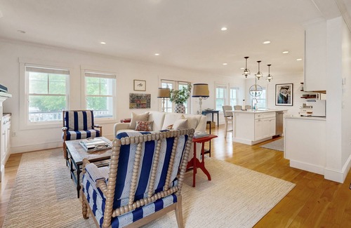 From its open design to its chic decor, the interior is a study in understated coastal style. At the heart of the living space is a breezy kitchen with upscale appliances and a large island. To one side is a bistro table where you can dine and play cards in the evenings with a view of the harbor. To the other is a living area with a smart TV to watch in the warmth of the gas fireplace.