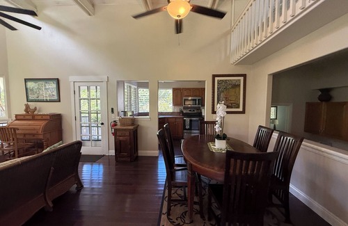 This plantation-style home, is a dream, with high vaulted ceilings and views from every window. Hot water comes from energy-efficient Solar generated water heaters. The estate owners make this unique home available when owners are not on the island. Beautiful copper gate protecting property privacy, Enjoy your delicious fresh fruit (all you can eat that is in season) from 100s of tropical trees as you bask on spacious covered decks, listening to the waves and enjoy ocean breezes. You might try Starfruit, three varieties of Avocados, Oranges, three varieties of Papayas, four varieties of Bananas, Mangos, two varieties of Lemons, Limes, Tangelos, Tangerines, Ademoyas, Figs, Cheremoyas, Cream Apples, Passion fruit, Strawberry Guava, Surinam Cherries, Pomelos, Lychees, Coconuts, pomegranates, two varieties of pineapples and two varieties of Grapefruit. Some fruits take up to 2 years to propagate such as pineapples. You will find 100s of rare, exotic flowers including orchids, heliconias, anthuriums, plumeria, red, pink, blue, white, yellow ginger, wood roses, and gardenias, to adorn your tables, make flower leis, or just enjoy in your yard. You may eat and use all of the fruit and flowers you like for your personal use. (Woodrose makes no guarantee of any fruits or flowers being available at any given time due to seasons and other uncontrollable causes). Woodrose Plantation is a licensed rental property. TVR/NCU #4180 (for emergencies call 808-320-0363)