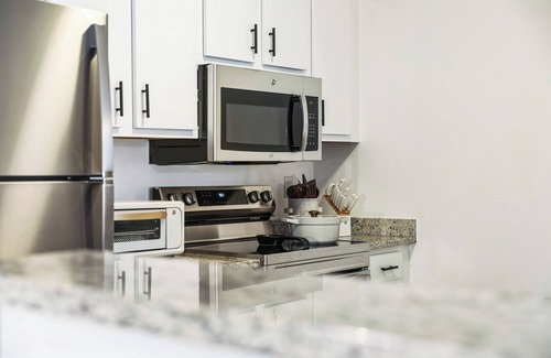 The fully-equipped kitchen boasts sleek stainless steel appliances, quartz countertops, and everything you need to whip up a quick meal. After a long day, unwind in the cozy bedroom with luxury linens and ample closet space.