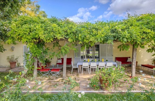 In the main house, a pergola furnished with sofas provides additional space for relaxation, while a pergola with direct access to the kitchen is furnished with sofas and a dining table, perfect for comfortable outdoor dining.
