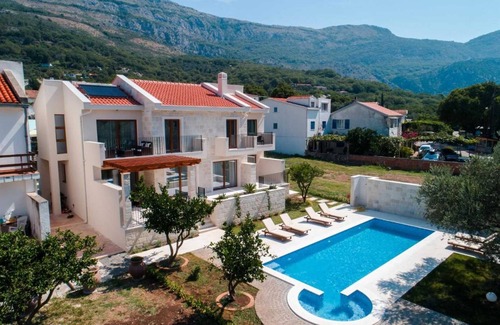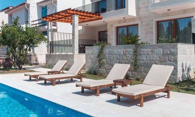 Elegant Villa where luxurious comfort dominates designed in contemporary minimalist style with Mediterranean spirit influenced in every detail. All setting is made to afford unforgettable and relaxed holiday and to make you feel special while enjoying in pure luxury. Villa features with 3 bedrooms, 3 bathrooms, 3 living rooms, 3 full size kitchens ,3 dining room, 6 balconies , outdoor swimming pool and stunning garden with olive trees and many other species of tropical and subtropical plants. There is also private parking place for our guests.