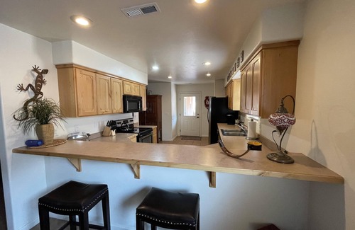 KITCHEN - the completely furnished kitchen provides everything you need to prepare elaborate meals, lunch for your daily adventures, and an early morning breakfast on the adjoining patio. We provide spices, condiments, aluminum foil, plastic wrap, dish soap, dishwasher soap, and other items you expect in your own home. In addition to the beautiful full-size appliances, we offer a toaster, coffee makers (Keurig & drip), coffee grinder, and a blender. Two stools are located at the kitchen counter.