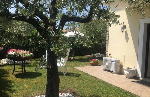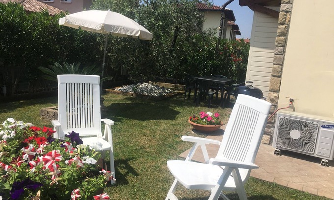 Two-room apartment on the ground floor, with large outdoor garden, composed of a double bedroom, living room with dining table and double sofa bed, kitchen, bathroom with shower, laundry and parking in the garage, the area is a short walk from the historic center of the village, with all services within walking distance, the lake is less than a kilometer away.