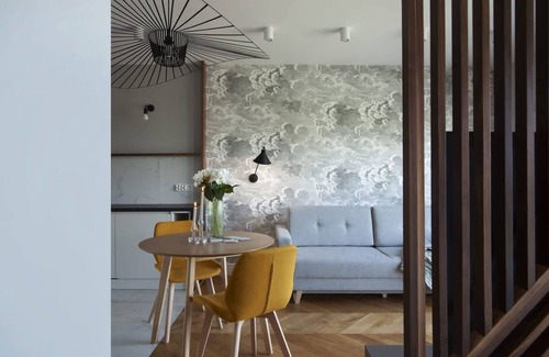 The main room here is the living room. Its central element is a beautiful, fold-out sofa, which will be perfect for relaxing after a day of sightseeing or a busy working day. Guests have at their disposal a large TV with a wide range of programs and a fast wifi network.