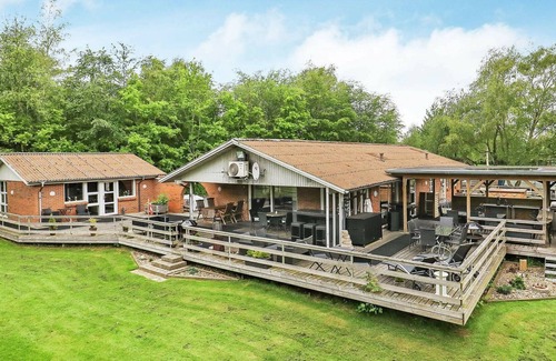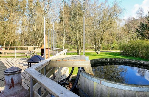 Holiday cottage with a 50 m² large wellness/activity room located on a large 2500 m² of enclosed plot with lawn. Firewood can be purchased at the house. The house contains a large living room with wood-burning stove and 4 large bedrooms. Large, open kitchen with all modern amenities such as dishwasher, 220 litres freezer and 2 sinks. One bathroom has direct access to the indoor whirlpool and sauna and access to an outdoor wooden tub (DanCenter provides no service at this) as well as the arctic bath tub with 5000 litres cold water. For the little ones there are cot, 2 high chairs, swings and sandpit and other playground equipment as a trampoline (usage at own risk/insurance). The house has billiards, table tennis, table football, bob, airhockey, large flat screen TV, X-box and Nintendo Wii. The house is equipped with heat recovery and ventilation and air-to-air heat pump which provides a good indoor climate. There are 235 m² terrace, 50 m² is covered, from which you can enjoy the view of the fjord. There is an insulated shelter in the garden. Free admittance to Skive water park.