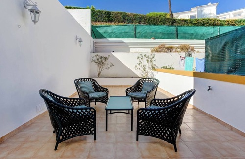 The apartment is located in the Center of Carvoeiro and has a spacious lounge and dining area with patio doors to a small balcony. The fully fitted kitchen is modern and stylish with everything you need for your holiday. Downstairs there is a master bedroom with double bed and en suite bathroom with walk in shower. There are doors to a an enclosed seating area which is perfect for the outer months providing a warm and light area to sit and read. Further from this there is a large external patio with BBQ and outdoor seating area. There is a second bedroom with twin beds and a further bathroom. The apartment is fully air conditioned, has electric shutters and has double glazing throughout so this is a perfect property if you looking for a quiet stay but dont want to rely on a car. The communal swimming pool has sunbeds and shaded areas and there is a separate pool for children.