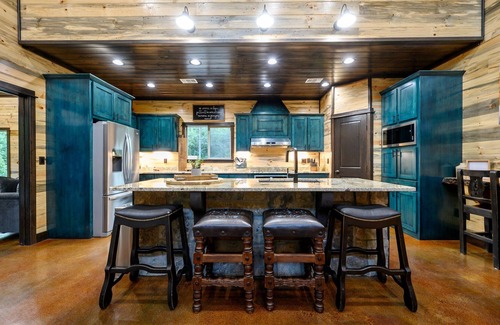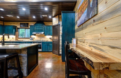 The kitchen itself is practical and well-equipped with stainless steel appliances and all the necessary cookware, including an oven, microwave, dishwasher, and electric stovetop. It's set up for you to easily prepare anything from a quick breakfast to a more involved dinner, making meals straightforward and hassle-free. This cabin combines comfort with functionality, providing a cozy retreat.