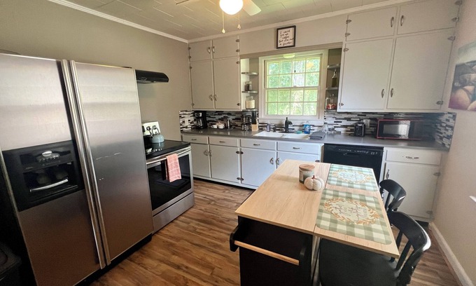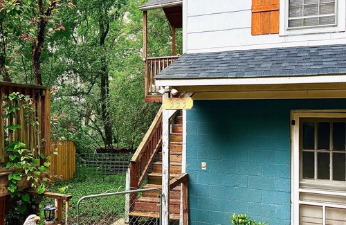 Enjoy all the town of Elkin, North Carolina, and the surrounding areas, have to offer from the comfort of this two bedroom, one bathroom apartment that is located within walking distance of Main Street. The space provides all of the amenities you expect and more including enclosed yard space for pets, Wi-Fi, streaming services, a full kitchen with dishwasher, and free use of laundry units. This garage apartment is located on the same property as the host's private residence but is a separate and private unit with it's own parking. The apartment has a fenced in area for pets to be secure - there is no extra fee for guests with pets but we do appreciate being provided the number and size of dogs coming to stay. The master bedroom offers a queen size bed while the second room has a full-size bed. The kitchen is well stocked with spices, coffee, and cookware; and also has a roll-away kitchen island and bar stools. The living room provides entertainment through a smart tv equipped with a Roku streaming device and the hosts provide access to Netflix and HBO Max. Guests can also use the Roku device to log into any other subscriptions they may have. There are stairs from the ground level driveway to access and enter the apartment. Guests can enjoy grilling out on a propane grill on the recently added exclusive deck.A short walk away, you will find the Elkin Farmer's Market, restaurants, antique shops, plenty of bars and restaurants, and even a launch point for kayaking the Yadkin River! The Elkin Vine Line will also pick you up and drop you off from the apartment!Come explore the foothills of Appalachia today!