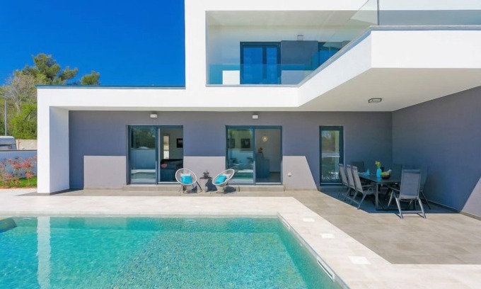 Premantura 11 km from Pula: Beautiful villa "Ella Premantura", 2 storeys, built in 2018. 250 m from the centre of Premantura, in a sunny position, 500 m from the sea, 500 m from the beach. Private: property 600 m2 (fenced), beautiful garden with lawn, swimming pool angular (8 x 4 m, depth 140 cm, seasonal availability: 04.Apr. - 10.Oct.) with internal staircase. Outdoor shower, barbecue. In the house: internet access, washing machine. Parking (for 2 cars) at the house on the premises. Shop 250 m, supermarket 4.5 km, restaurant 50 m, bus stop 220 m, pebble beach 2.5 km, rocky beach 500 m. Surf school 2.5 km, tennis 750 m, riding stable 10 km, walking paths from the house 100 m, cycle lane 150 m. Nearby attractions: Nature park Kamenjak 650 m. Groups of teenagers on request only. Neighbourhood highly sensitive to noise. Quietness and good behaviour expected. Swimming pool with hydromassage.