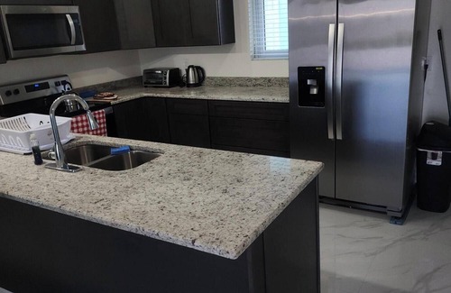 While you're here, you can enjoy all the comforts of home and more, including a private pool and a full-sized refrigerator/freezer, as well as an oven and a dishwasher. Other amenities include towels, kitchenware and utensils, a toaster oven, and an ironing board.