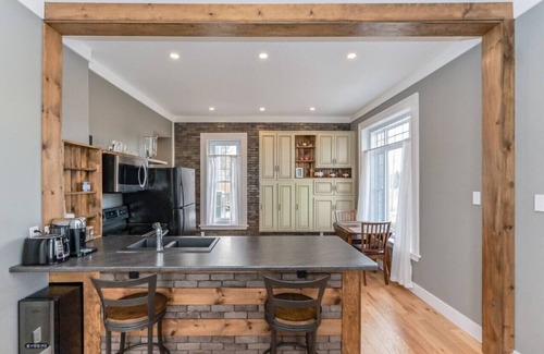 This newest Airbnb is called the Gingerview. Enjoy your morning coffee looking out towards the grand river and just past that, see all the unique buildings that make up Mill St. From the Mill to the main St. the view is complete and is yours enjoy. Also on this level you have a complete kitchen and a cozy comfortable space to watch your favorite Netflix Shows. Each floor has a bathroom the main bathroom is on the second floor where your Two bedrooms are.