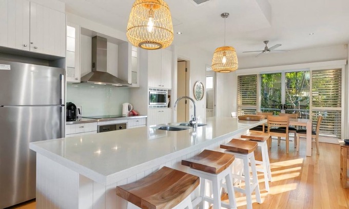 Offering modern fresh interiors providing you with a comfortable luxurious stay, 2 Elouera is a fantastic house alternative with its own exclusive use swimming pool. Enjoy relaxing undercover on the elevated patio beside the pool where the sunlounges can be positioned to capture your ideal aspect. The alfresco high dining table on the lower patio flows from the internal floorplan with ease and is a wonderful spot to enjoy poolside drinks or gather for a BBQ.