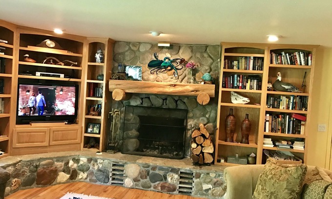 This home has many amenities, including outside sitting areas, barbeque, a deck overlooking the river, lovely cabin set ups in bedrooms, kitchen and living areas. Each bedroom has a queen bed with new mattresses, huge fireplace in great room with plenty of wood, air conditioning and several tvs with cable and wifi. A spa tub is in the master upstairs bathroom and a skylight in the bedroom. A washer and dryer are off of the kitchen. Everything you could want or need is there.