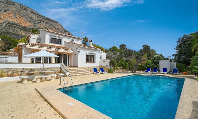 Beautiful and comfortable holiday home with private pool in Javea, Costa Blanca, Spain for 10 persons. The house is situated in a residential beach area and at 4 km from La Grava, Javea beach. The holiday home has 5 bedrooms and 3 bathrooms, spread over 2 levels. The accommodation offers a garden with gravel and trees, a beautiful pool and a view of the mountains. Its comfort and the vicinity of the beach, places to shop, sports activities, places to go out, sights and culture make this a fine holiday home to spend your holidays in Spain with family or friends.