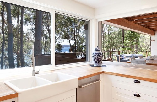 Accessed via boat and in an elevated position near the waterfront, the home has expansive views of both Elvina Bay and Lovett Bay. Lovett Bay beach is just a 50m walk from the house, so you can wander down towards the shoreline to sunbathe, picnic, kayak and more. The jetty on the Elvina Bay side is a favourite for jumping off and swimming!