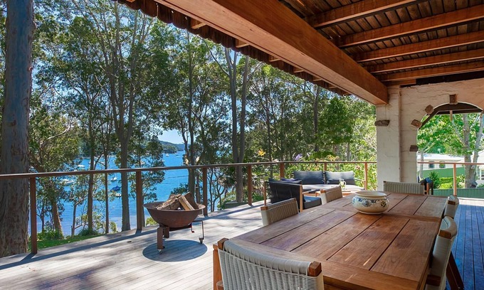 The full modern kitchen has new appliances, and there is a large indoor dining table. Sliding doors from the living room glass doors open for combined indoor/outdoor living and reveal an expansive outdoor entertainment deck overlooking gorgeous Lovett Bay. Dine al fresco at the beautiful timber table for 10 or stretch out on the comfortable casual seating area. There is also a bar fridge, gas BBQ for grilling delicious meals and firepit for toasting marshmallows - all whilst watching the sunset and boats glide by in the distance, with nature all around. Have a family pizza night and use the wood-fired pizza oven! There is an additional elevated deck in the garden with a daybed for naps in the sun.
