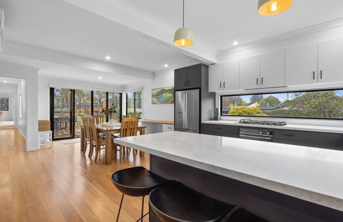 This recently renovated light filled and stylish house backs onto the Mansfield Golf Course offering views of both the mountains, from the raised pool area, and the golf course from the huge deck and dining and living areas.