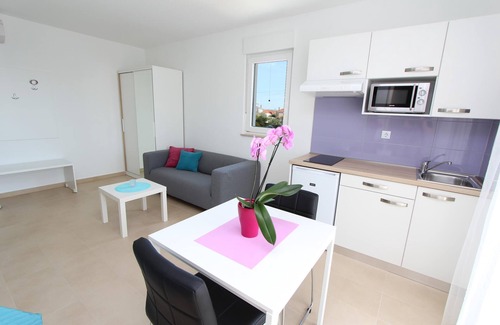 EMANUEL Studio with Balcony 1 is a 3 star Studio. It is located in 10 minutes walking distance from town center and in 15 minutes walking distance from the nearest beach. Interior size is 27 m2 and balcony is 6 m2. It is located on floor: 1. Bed linen and bath towels are provided by the accommodation itself.