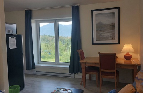 Spacious Studio apartment (50 qm) with one large bedroom, full equipped kitchen and dining area. Beautiful views towards the mountains in both directions: Selkirk and Purcell Mountains. New suite in a house on a hill with amazing views (1 of 2) . Modern furniture like two comfy love seats and new appliances in the kitchen. King size teak bed with indirect light from shelf above. European bedding is available for two guests. Huge windows give lots of daylight and the wonderful views towards the mountains and the valley.