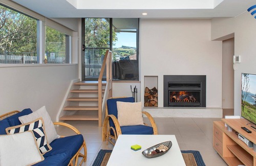 The house is big, bold and spacious! It sleeps 9 and caters to diverse groups of different combinations of guests with its flexible bed configuration and numerous, large entertaining spaces. For starters, there is a large modern kitchen with space galore for cooking. It leads out to a sunny north facing deck where you can entertain and admire glimpses of the ocean.