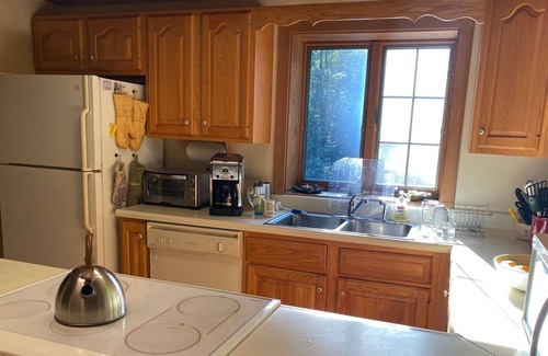 The house features refined post-and-beam construction and a spacious great room, with a fireplace, cozy sofas and armchairs, books, puzzles, games, 4K TV with ATT Choice cable and Apple and Roku TV and DVD, plus Sonos WiFi speakers. The house is well set up for extended work-from-home with hi-speed internet monitor and a laser printer. The kitchen is equipped with anything an enthusiastic cook might need. There is a half-bath and laundry room on the main floor and two full baths upstairs, including a private master bath. A modest set of stairs leads to the second floor. The stunning master bedroom includes a soaring arched picture window and a skylight perfect for stargazing from bed.