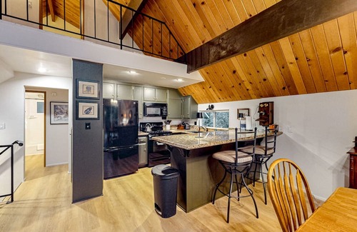 Inside, feel right at home in the cozy, open-concept living area featuring high wooden ceilings, tasteful decor, and wall-to-wall windows bathing the space in natural light. Snuggle up by the wood-burning fireplace for family movie night or play pool and darts while sharing lots of laughs with friends! A stylish full kitchen welcomes you to whip up a delicious home-cooked meal, then retreat to the wraparound deck for a sunset cocktail. The breathtaking views and crisp mountain air will inspire lifelong vacation memories.