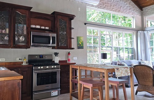 Just steps from the Macal River this charming home offers a shared pool, inviting outdoor kitchen, A/C, and a spacious patio overlooking the river and vibrant jungle.