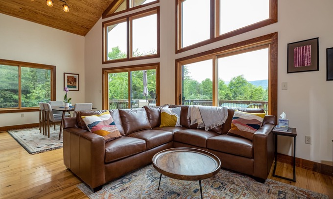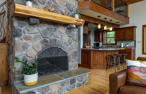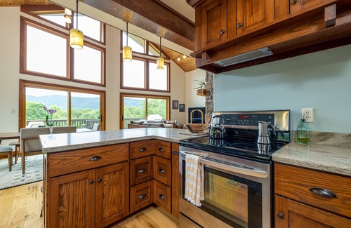 While offering seclusion and relaxation, Meadowlark Cabin still offers all the comforts of home. Inside, you'll find a fully-equipped open kitchen that flows into the dining area and living room complete with wifi internet, streaming television, and a cozy stone fireplace. From the spacious open living area, you’ll have a great view of the large yard plus astounding views of the Massanutten Mountains through the massive, beautiful window wall.