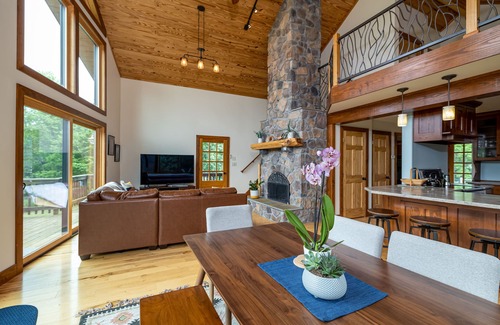 Rest up from a day of enjoying the great outdoors in the gorgeous, master bedroom loft, gazing out the large chalet style windows or in a chair on the large deck overlooking Kennedy’s Peak Mountain top. The cabin also features a bunk style room with large laundry closet on the ground floor, and a third bedroom with a king size bed in the basement with a full bathroom, private deck of its own, and large 7 person hot tub.