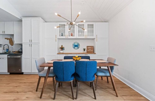 Inside, the home is tastefully updated with new furniture, TVs in every room, and artistic murals throughout. The garage has been transformed into a fun-filled game room, complete with air conditioning, ping pong, TV, Nintendo with games, a Pac-Man arcade game, and a cozy sofa. Sleeping up to 10 guests, this property is perfect for family vacations or group getaways, and it's just a short bike ride away from the beach.