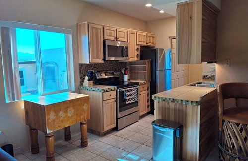 Enjoy breathtaking views of the Santa Rita Mountains from the spacious backyard patio, primary suite and Arizona room. The patio comes equipped with a gas grill, covered porch with sunshade, comfortable furniture and gas fire pit table to enjoy the sunshine and sunset views. Our single level townhouse is warmly decorated and includes a large living room, primary suite with queen bed and full bathroom with walk-in shower. The guest bedroom also has a queen bed and full bathroom with walk-in shower.. The kitchen is fully equipped and has all the amenities you will need, including dishwasher, microwave, coffee maker, etc. A washer and dryer along with all linens, blankets and towels are supplied. Our home has free WiFi and smart TV in the living room with Roku Stick to provide basic channels as well as access to your streaming services. Our townhouse provides access to Green Valley Recreation which offers amazing activities at a number of facilities dispersed throughout the community, most with incredible swimming pools, and a variety of amenities, some within walking distance. These facilities require a tenant pass which we have information on, along with a number of guides and literature for hiking in the area as well as other close by attractions, all included in our guest book.