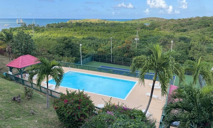 Look no further--Enjoy your Caribbean vacation in this beautiful ocean-view condo! This 2 bedroom, 2 bathroom property is conveniently located near beaches, a grocery store, restaurants, shops and so much more. Watch the boats go by while relaxing on the covered porch. This community has tennis courts, two pools (one pool is located just a few feet from the condo), and on-site security. The property gets amazing tropical breezes, but if you prefer, it offers AC throughout.