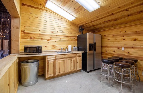 The home itself is a semi-rustic, cowboy themed getaway with three bedrooms, three baths, and hide-a-beds that can sleep 15 with floor space for more. Dining sits 16 between the dining room table and bars. RV’s are welcome at an additional fee. 2 wheel drive vehicle accessible.