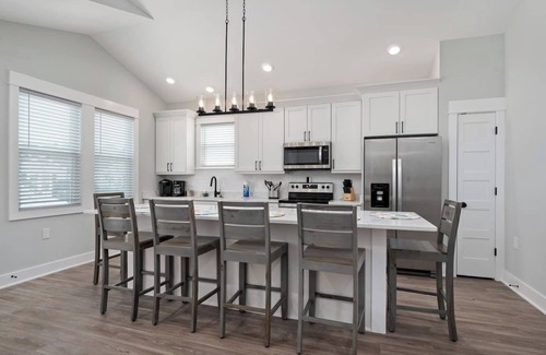 The kitchen boasts a 10-foot center island. The kitchen comes equipped with everything from pots and pans to utensils and small wares. We also provide both a drip coffee maker and Keurig for you convenience.