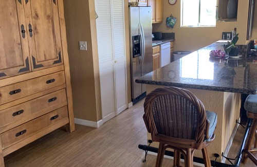 Corner condo with two lanais. Watch sunrise with birds chirping and peek -a-poo ocean views. King bed fully furnished ,basic tv wi-fi internet all utilities included. Swimming pool and BBQ area. Stairs and elevator,access, minuets away from the ocean and dining . Why not work from your condo away from office!